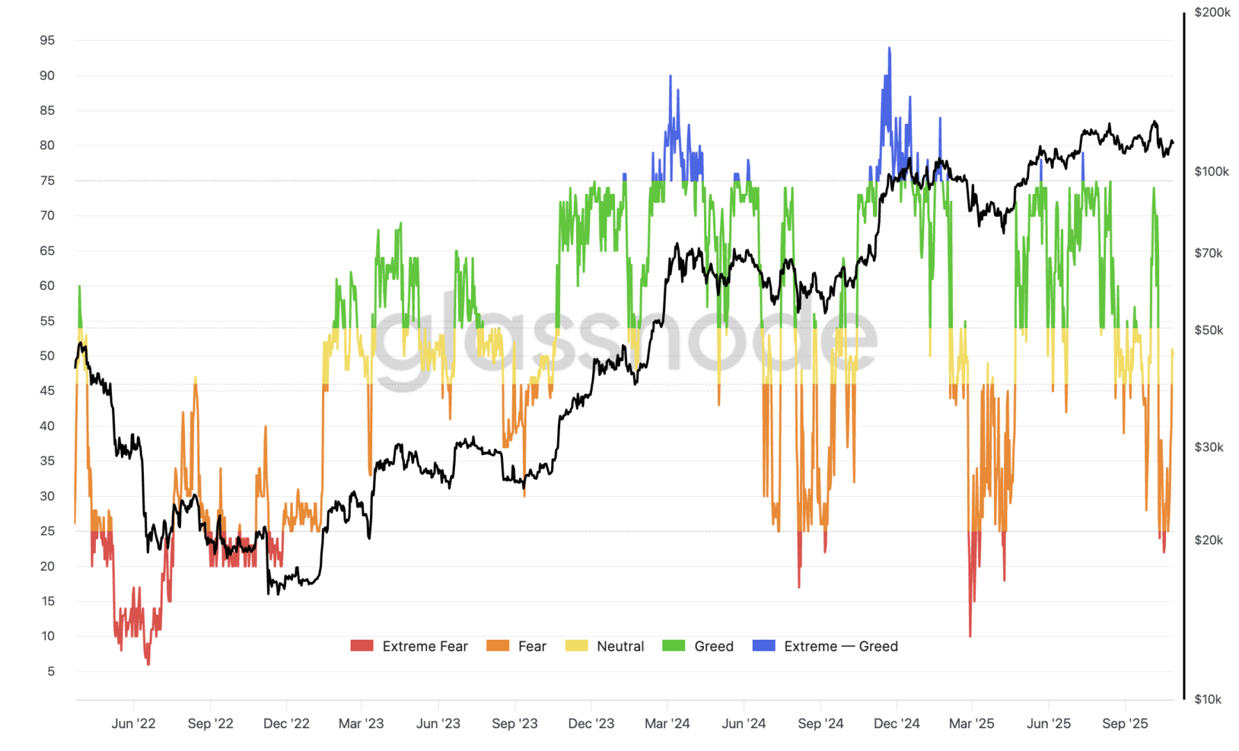 Suite au rebond du Bitcoin qui a ramené le cours au-dessus des 116 000 $, l’indicateur de sentiment de marché est de retour en zone de neutralité (jaune). Depuis le plus bas de marché enregistré en fin d’année 2022, les périodes haussières arrivent quand le sentiment de marché est positif (euphorie/extrême euphorie). Pour l’instant, le marché semble être en train de digérer la précédente baisse.