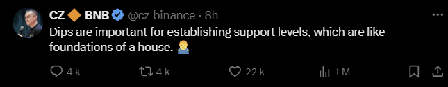 Après une hausse spectaculaire, le jeton semble entrer dans une phase de stabilisation autour de 1,3 euro. Pour certains analystes, ce mouvement pourrait n’être qu’un retracement technique nécessaire avant une nouvelle phase d’appréciation. C’est en tout cas ce que laisse entendre CZ via son post sur X il y a quelques heures, mais s’il ne prend pas le risque de dire jusqu’où ira le dip.