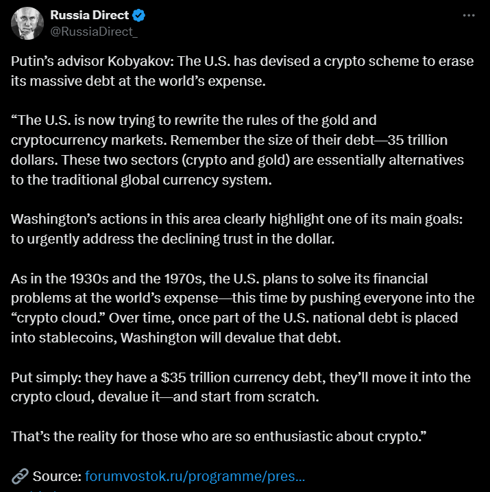 - Selon un conseiller de Poutine, Washington utiliserait les stablecoins pour dévaluer sa dette de 35 000 milliards de dollars, suscitant un choc géopolitique autour des cryptos.