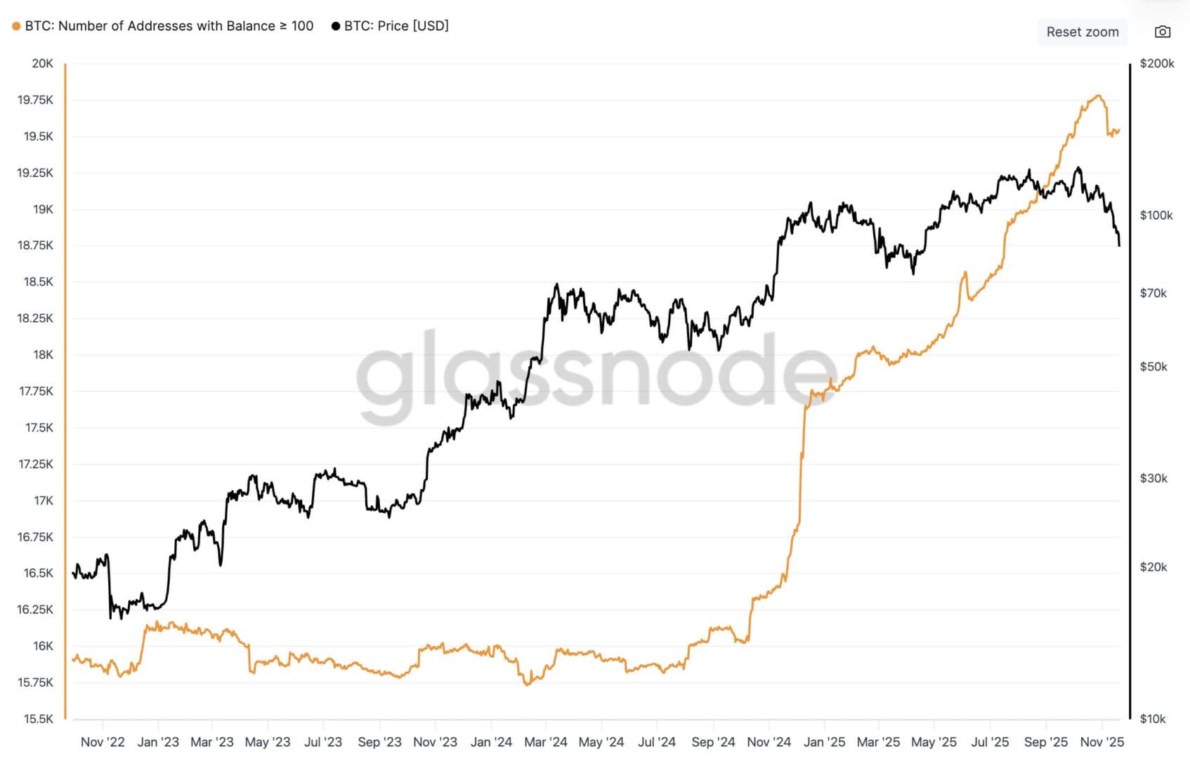 Les adresses qui ont plus de 100 BTC ne capitulent pas